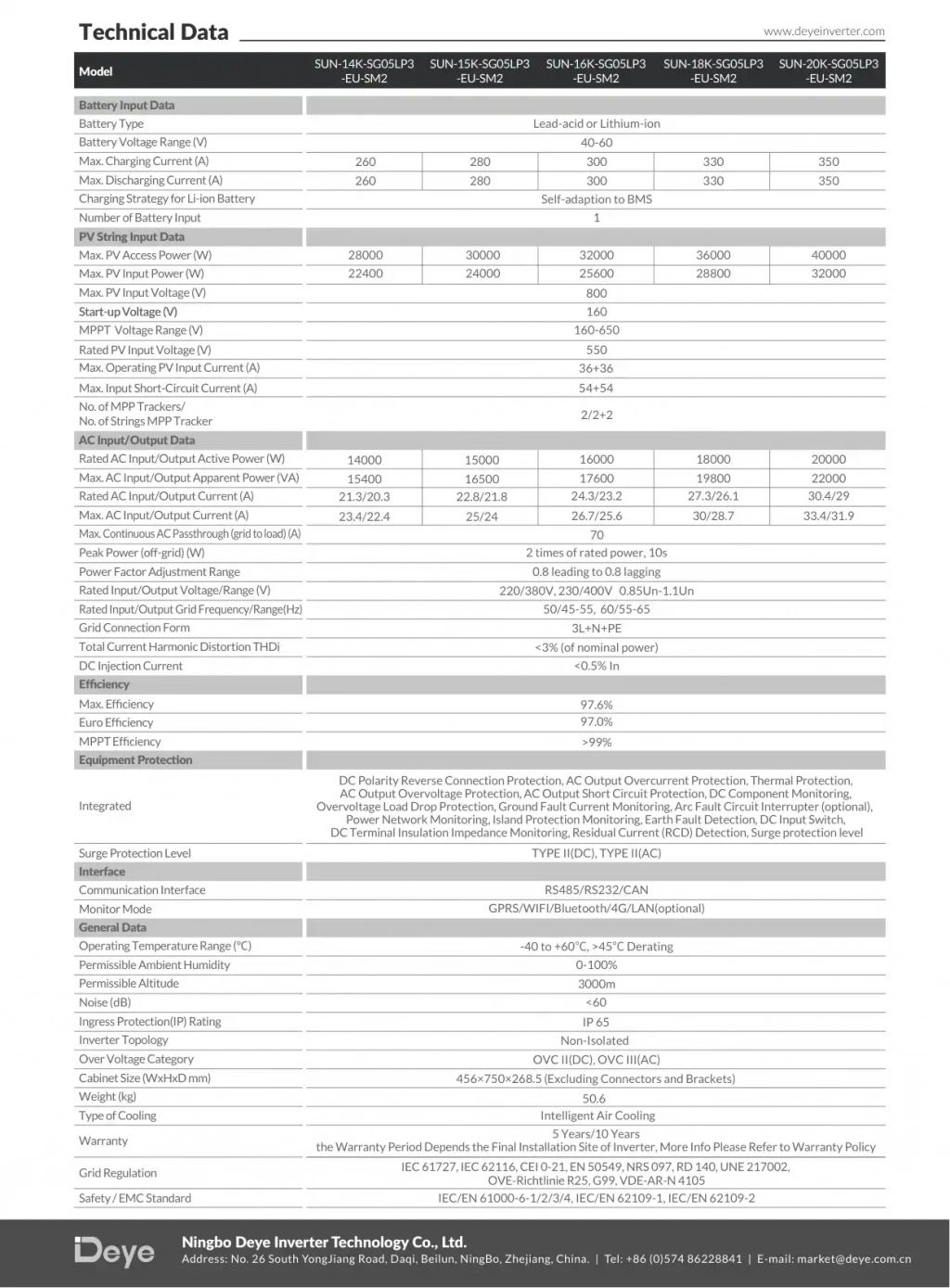 Teknik Özellikler – Deye 20 kW Trifaze LV Hibrit İnverter