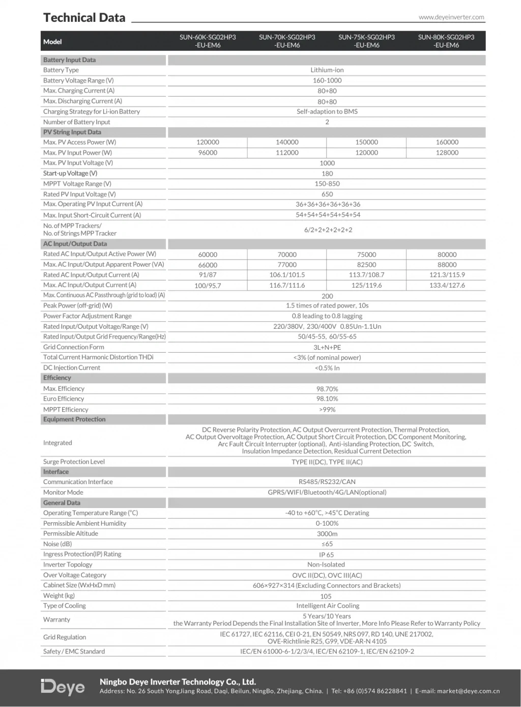 Teknik Özellik Tablosu – Deye 60 kW Trifaze HV Hibrit İnverter