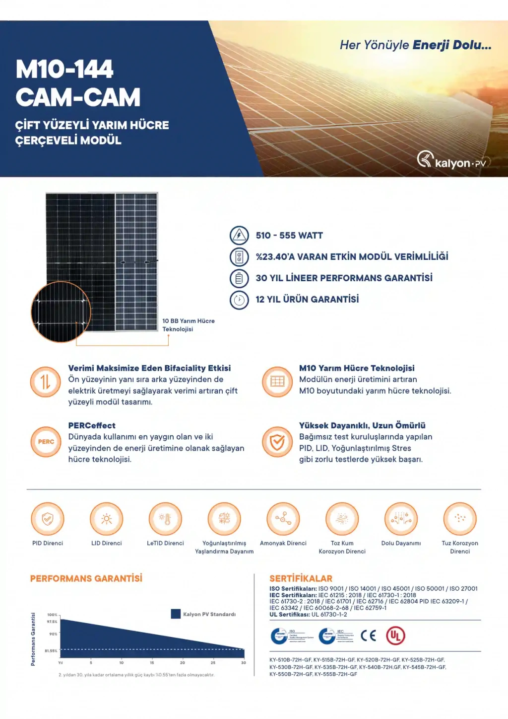 Ürün, 30 yıl lineer güç garantisi ve 12 yıl ürün garantisi ile uzun vadeli yatırım güvenliği sunar. Kalyon’un ileri üretim teknolojisiyle geliştirilen M10 hücreleri, düşük ışık koşullarında dahi yüksek performans sağlar. IP68 bağlantı kutusu, çift cam yapısı ve yüksek kalite MC4 uyumlu konektörleri ile zorlu çevre koşullarına karşı maksimum dayanıklılık sunar.