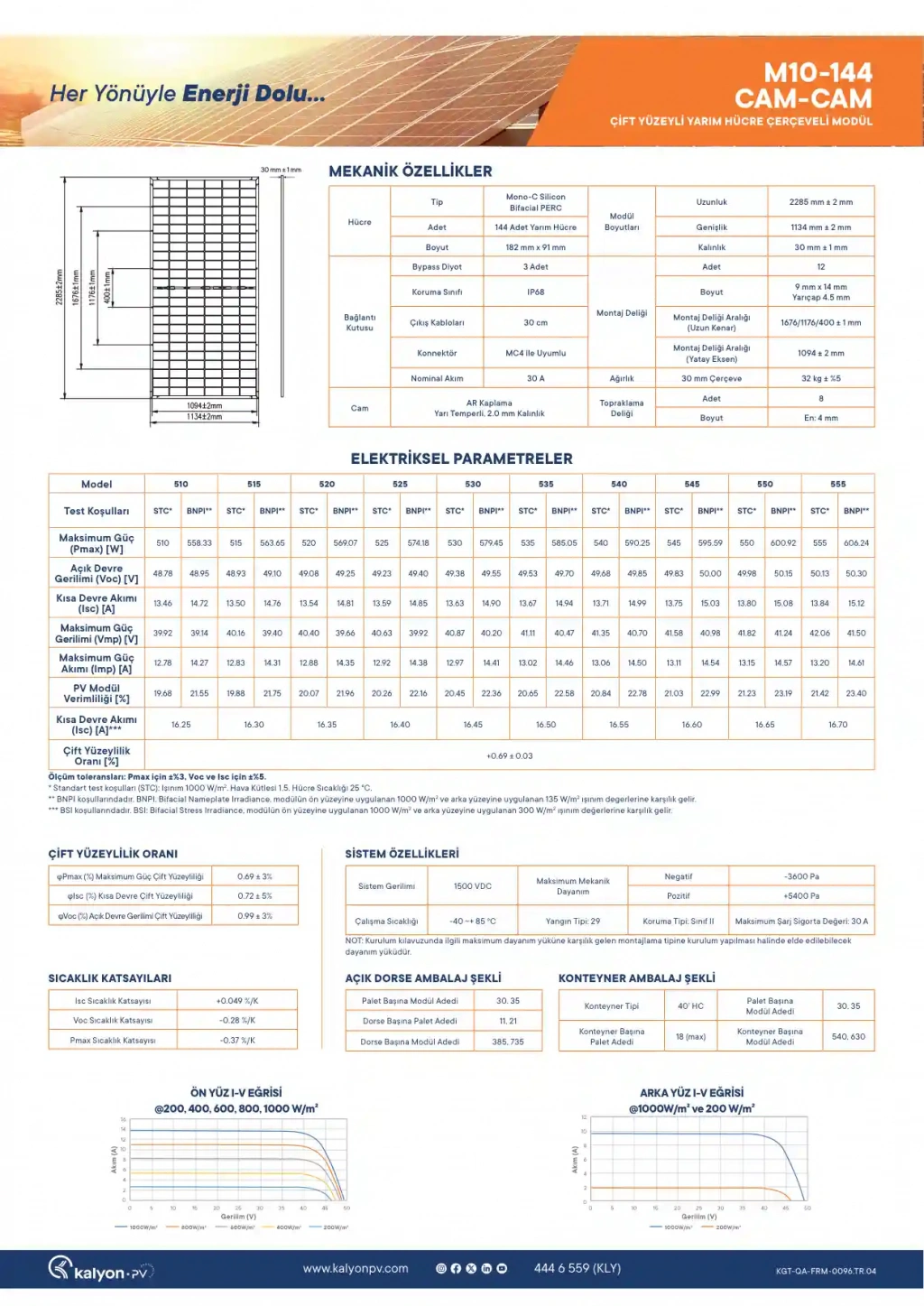 Kalyon PV 550W M10 144HC Bifacial G2G Teknik Özellikler