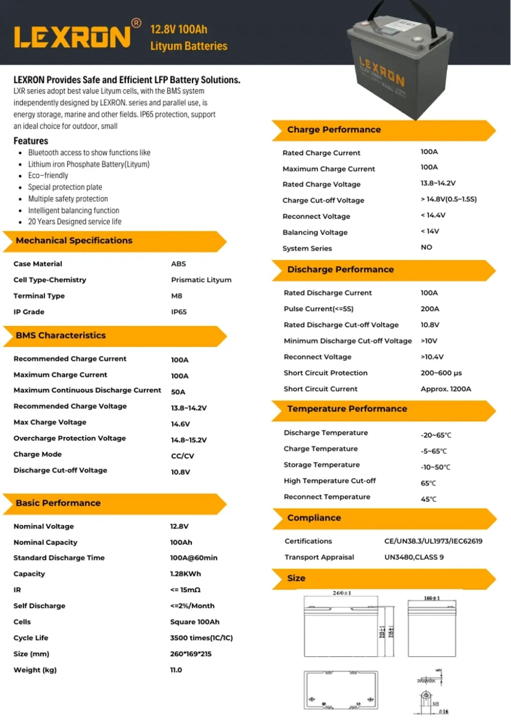 Lexron 12.8V 100Ah lityum akü, klasik kurşun asit akülere göre çok daha yüksek performans sunar. Daha hızlı şarj olur, daha derin deşarja dayanır ve kapasite kaybı çok daha düşüktür.