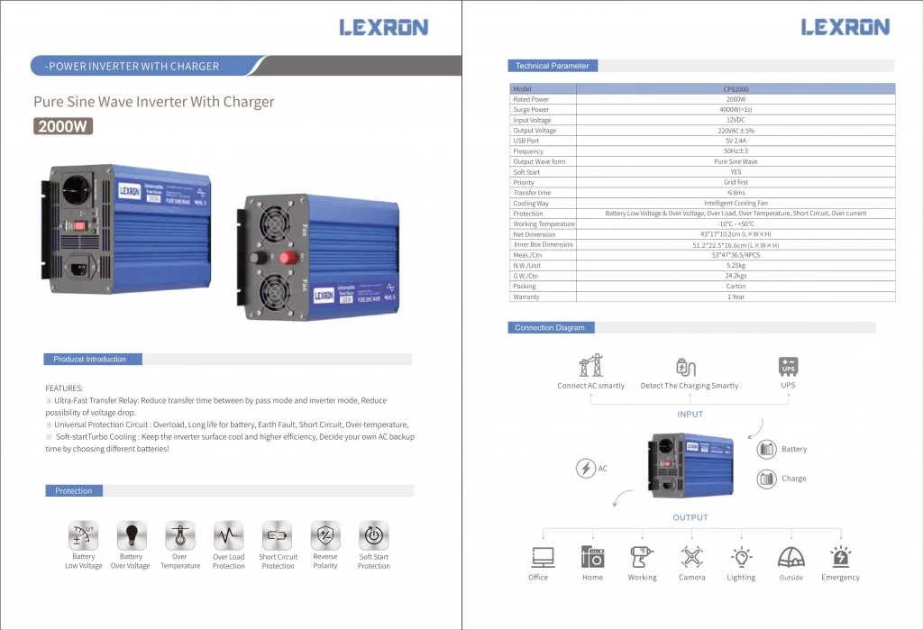 Lexron CPS2000, 12V sistemler için tasarlanmış yüksek performanslı bir tam sinüs UPS inverter modelidir. 2000W sürekli güç ve 4000W anlık tepe gücü sunarak ev, ofis, karavan, tekne ve kritik cihazların kesintisiz enerji ihtiyacını güvenle karşılar.