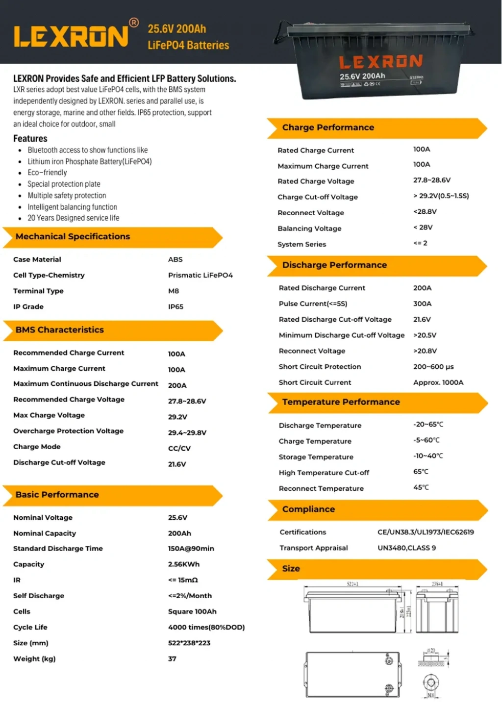Lexron 25.6V 200Ah Lityum Batarya, yüksek performanslı LiFePO4 (Lityum Demir Fosfat) hücre teknolojisi ile üretilmiş, profesyonel enerji depolama çözümüdür. 5.12 kWh enerji kapasitesi, güçlü BMS koruma sistemi ve 4000 çevrime kadar uzun ömürlü kullanım avantajı ile solar enerji sistemleri, karavan projeleri, marin uygulamaları ve mobil enerji çözümleri için mükemmel tercihtir.