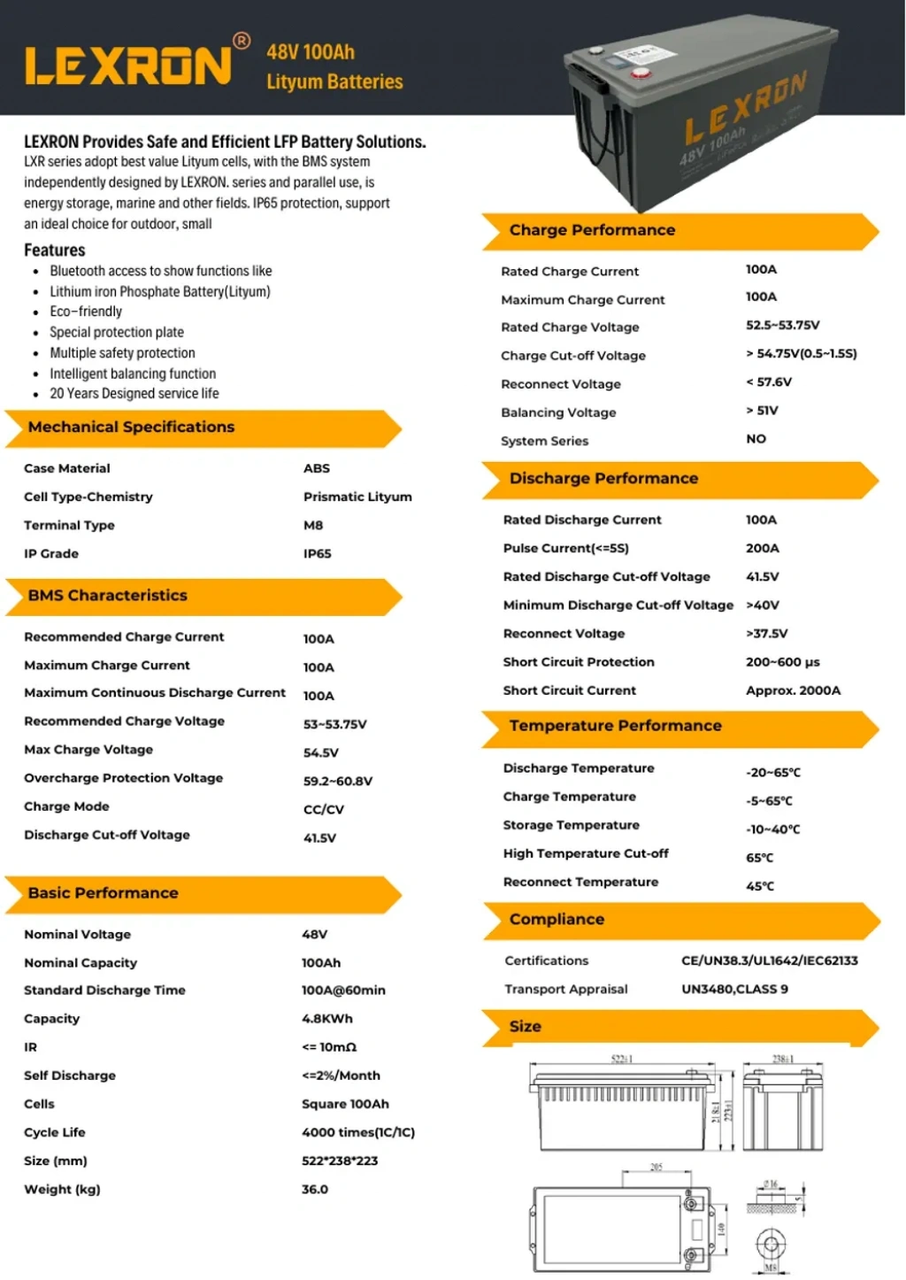 Geleneksel jel ve AGM akülere göre daha hafif, daha verimli ve çok daha uzun ömürlü olan Lexron 48V 100Ah batarya; gelişmiş BMS sistemi ile maksimum güvenlik sağlar. 48V sistem kullanan hibrit ve off-grid inverterlerle uyumlu çalışır.