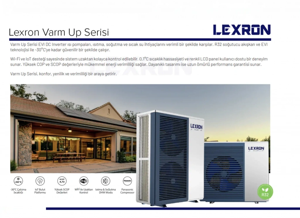 Kış şartlarında -30°C'ye kadar çalışabilen Lexron 8 kW Monoblok Isı Pompası; sessiz çalışma seviyesi, dayanıklı kasası, IPX4 koruma sınıfı ve akıllı kontrol altyapısıyla yüksek standartlı bir ısıtma deneyimi sunar.