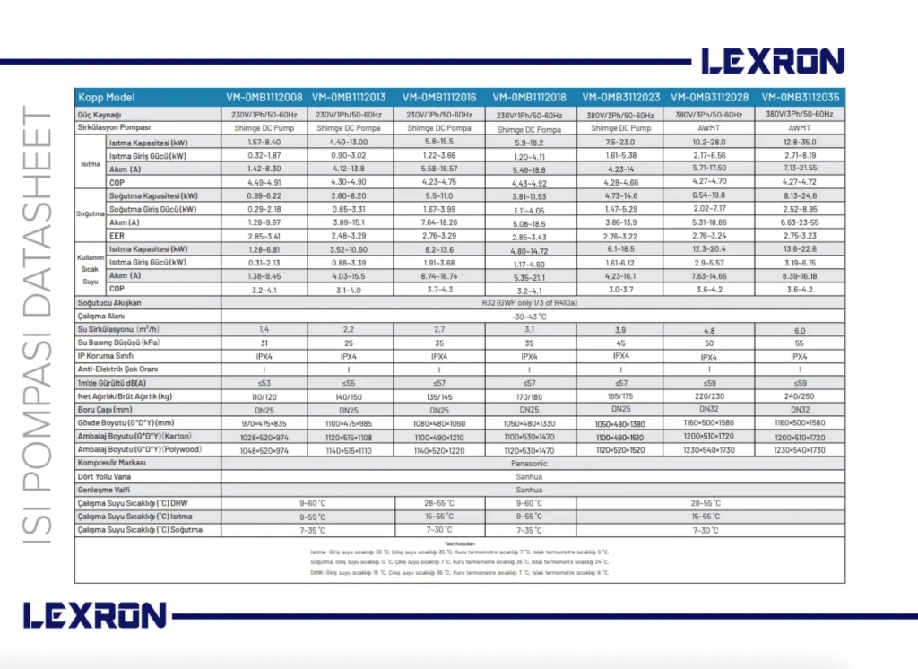 Teknik Özellikler – Lexron 8 kW Monoblok Isı Pompası (VM-0MB1112008)