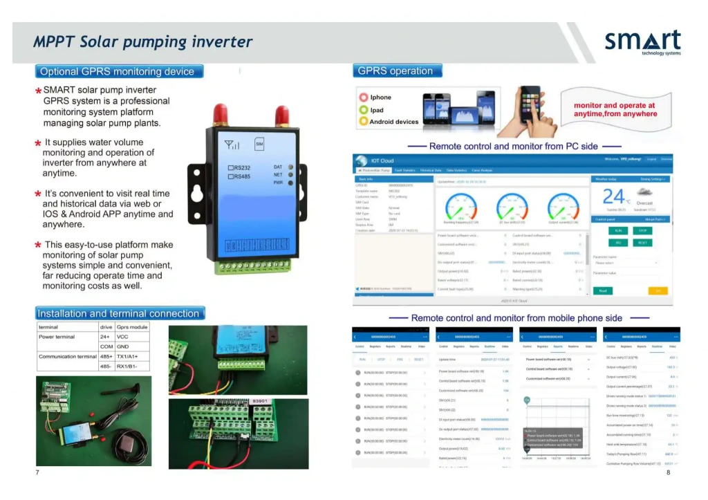 Smart Solar Pompa İnverteri GPRS Kit, güneş enerjisiyle çalışan sulama sistemlerinin uzaktan kontrolünü ve gerçek zamanlı izleme kabiliyetini sağlayan gelişmiş bir iletişim modülüdür. Güçlü GPRS bağlantı altyapısı sayesinde sisteminizin çalışma durumu, hata bildirimleri, anlık üretim verileri ve pompa performansı mobil cihazlardan veya online platform üzerinden kesintisiz olarak takip edilebilir.