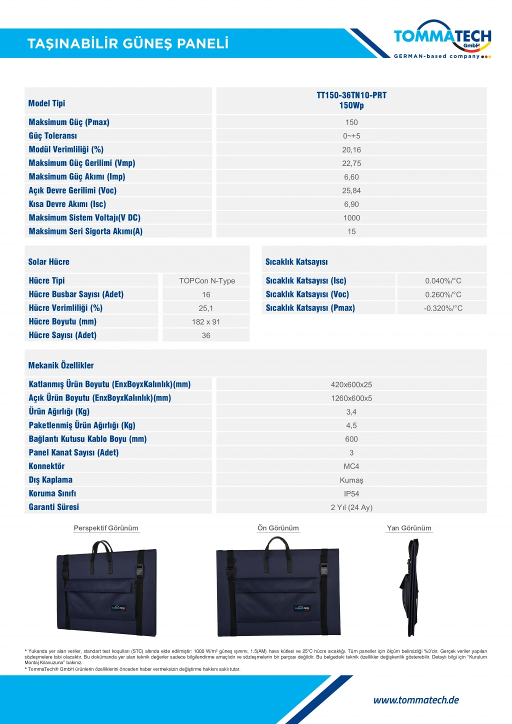 TommaTech 150W Taşınabilir Güneş Paneli, 2 yıl (24 ay) üretici garantisi ile sunulmaktadır. Bu garanti kapsamında ürün, üretim ve malzeme hatalarına karşı güvence altındadır.