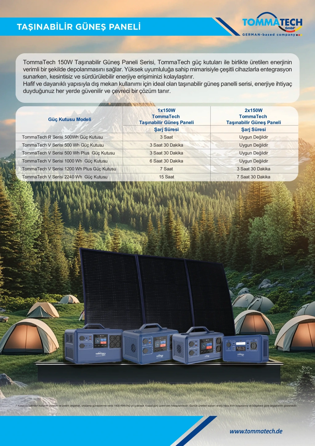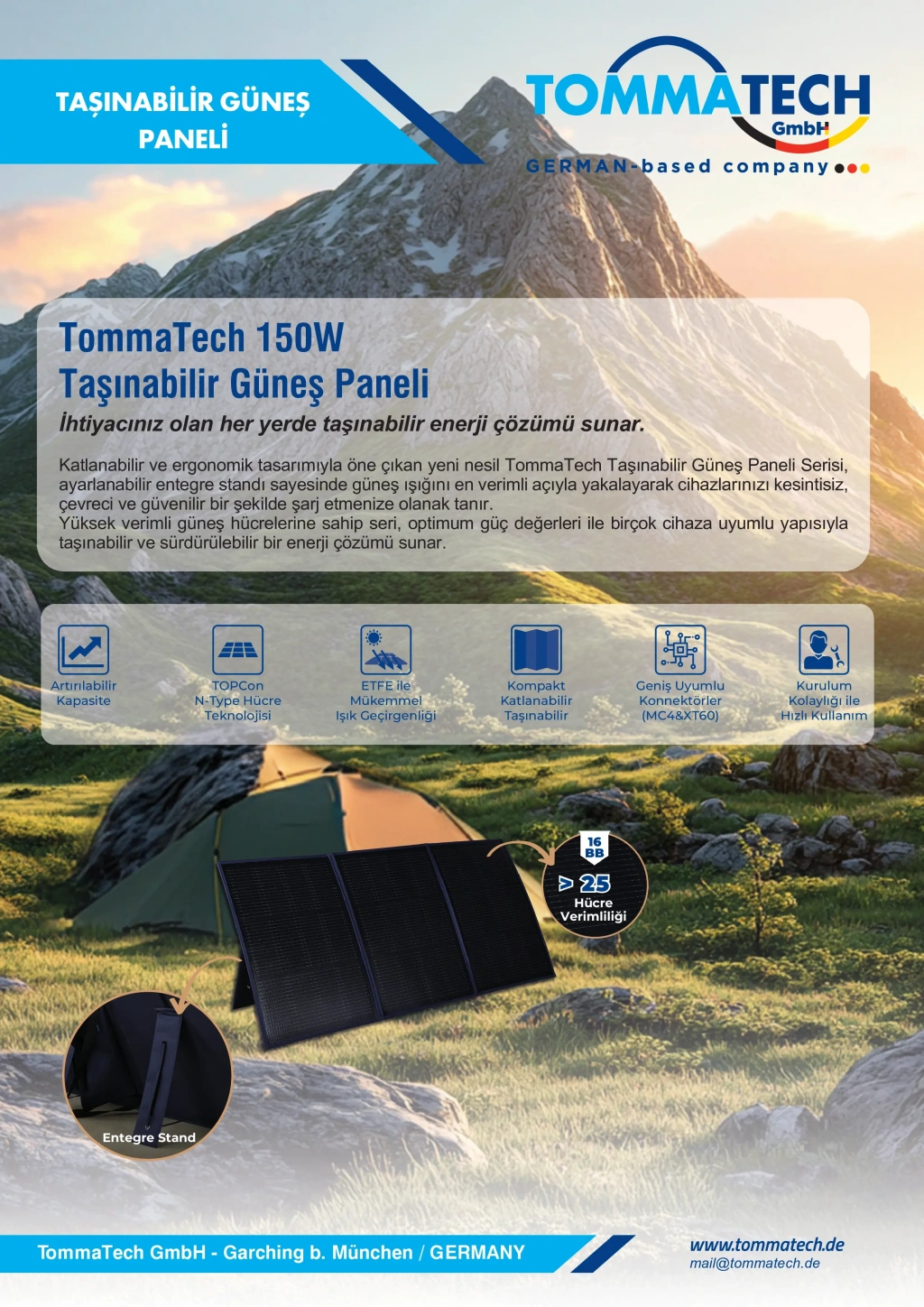 TommaTech 150W Taşınabilir Güneş Paneli, yüksek verimli hücre teknolojisi ve kompakt tasarımıyla mobil enerji ihtiyaçları için geliştirilmiş profesyonel bir çözümdür. Kamp, karavan, tekne, off-grid yaşam alanları ve acil durumlar için ideal olan bu panel, bulunduğunuz her ortamda kesintisiz ve sürdürülebilir enerji üretimi sağlar.