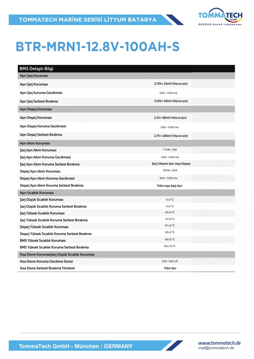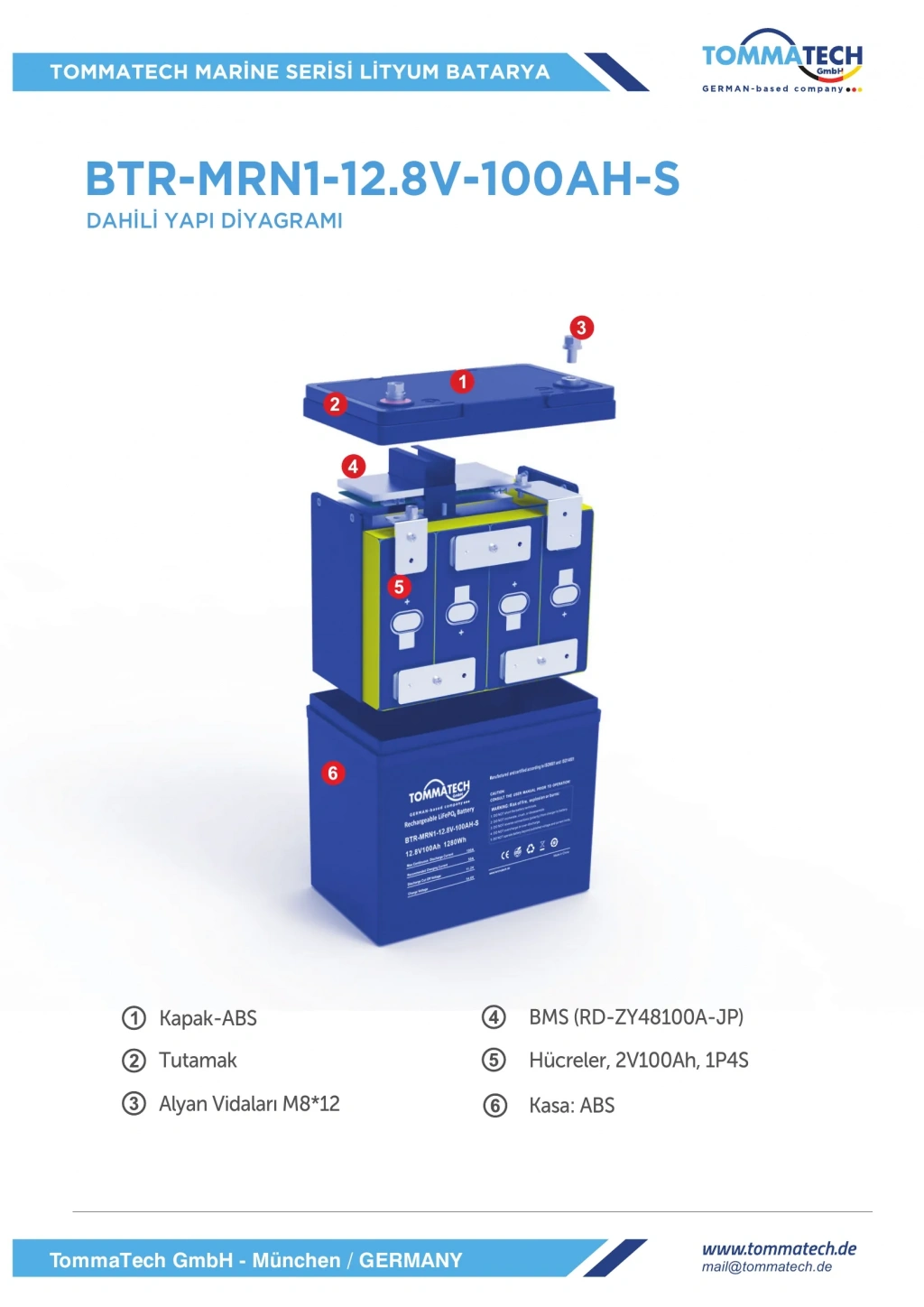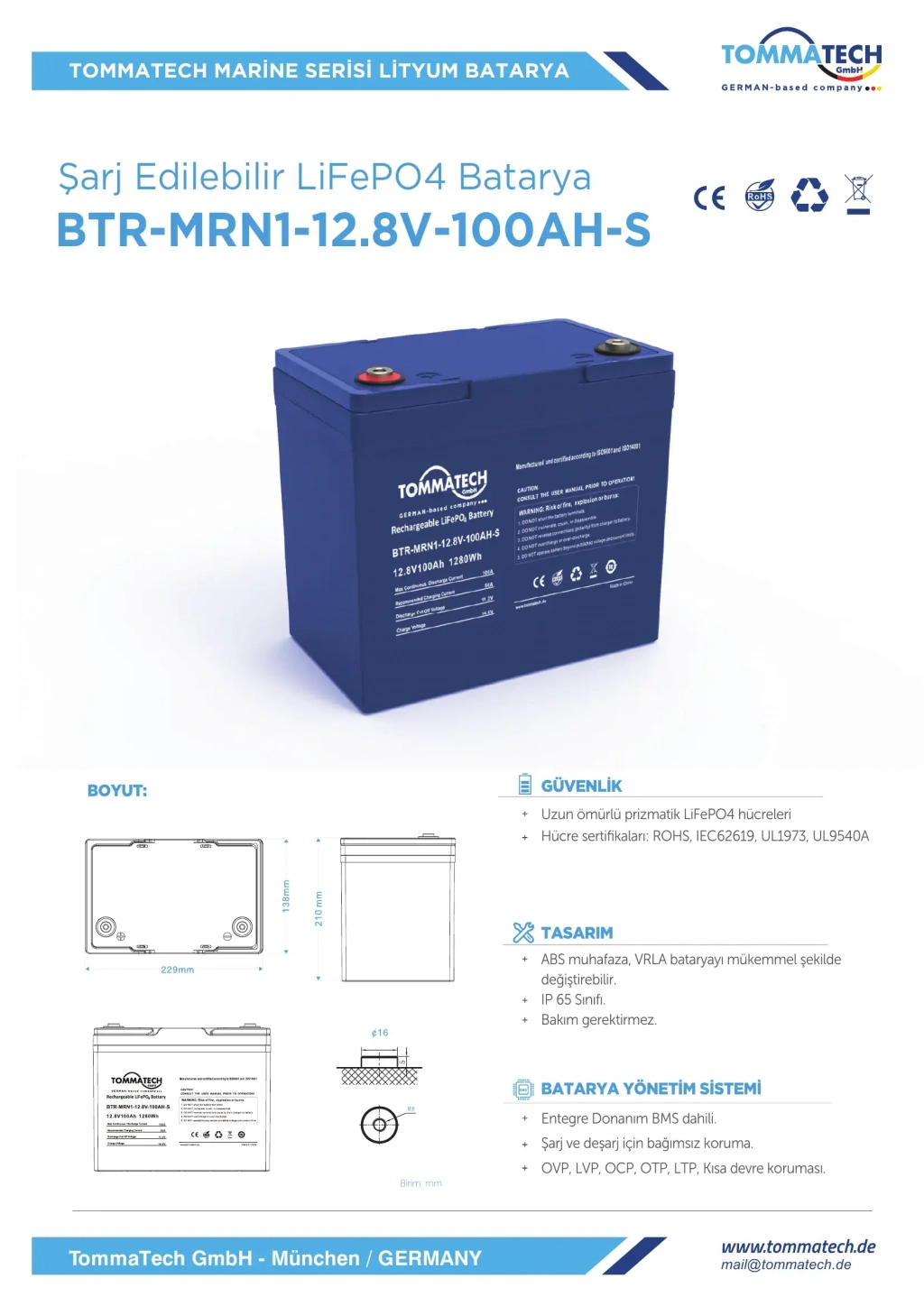 TommaTech ABS+PC Kasa 12.8V 100Ah LiFePO4 Marine Batarya, denizcilik uygulamaları, off-grid güneş enerji sistemleri, karavan sistemleri, tekne enerji depolama çözümleri ve yüksek çevrim ömrü gerektiren profesyonel uygulamalar için geliştirilmiş uzun ömürlü lityum enerji depolama çözümüdür. Prizmatik LiFePO4 hücre teknolojisi sayesinde yüksek güvenlik, stabil performans ve düşük bakım ihtiyacı sunarak geleneksel kurşun asit akülere kıyasla daha uzun kullanım ömrü sağlar.