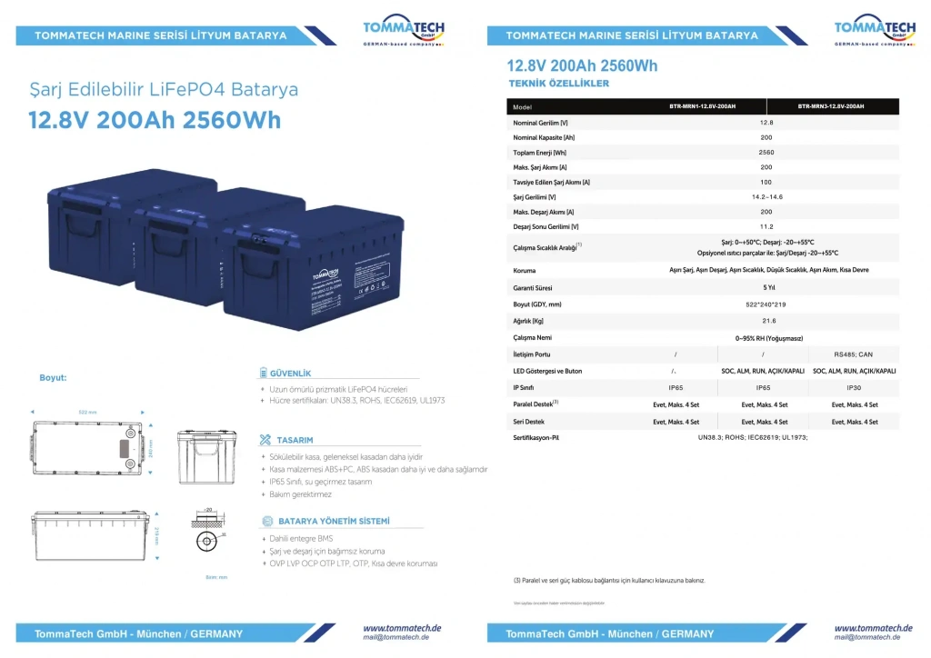 TommaTech Marine Serisi 12.8V 200Ah LiFePO4 Lityum Batarya, yüksek enerji yoğunluğu, uzun çevrim ömrü ve gelişmiş güvenlik özellikleri ile solar enerji sistemleri, karavan uygulamaları, denizcilik (marine), off-grid sistemler ve mobil enerji çözümleri için tasarlanmış profesyonel bir enerji depolama çözümüdür.