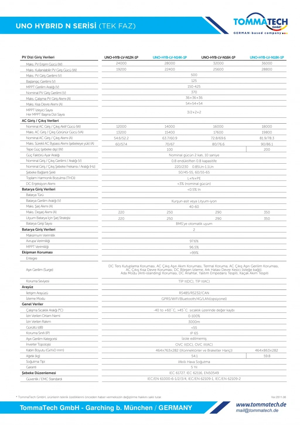 Teknik Özellikler – TommaTech Uno Hybrid N Serisi 16.0 kW
