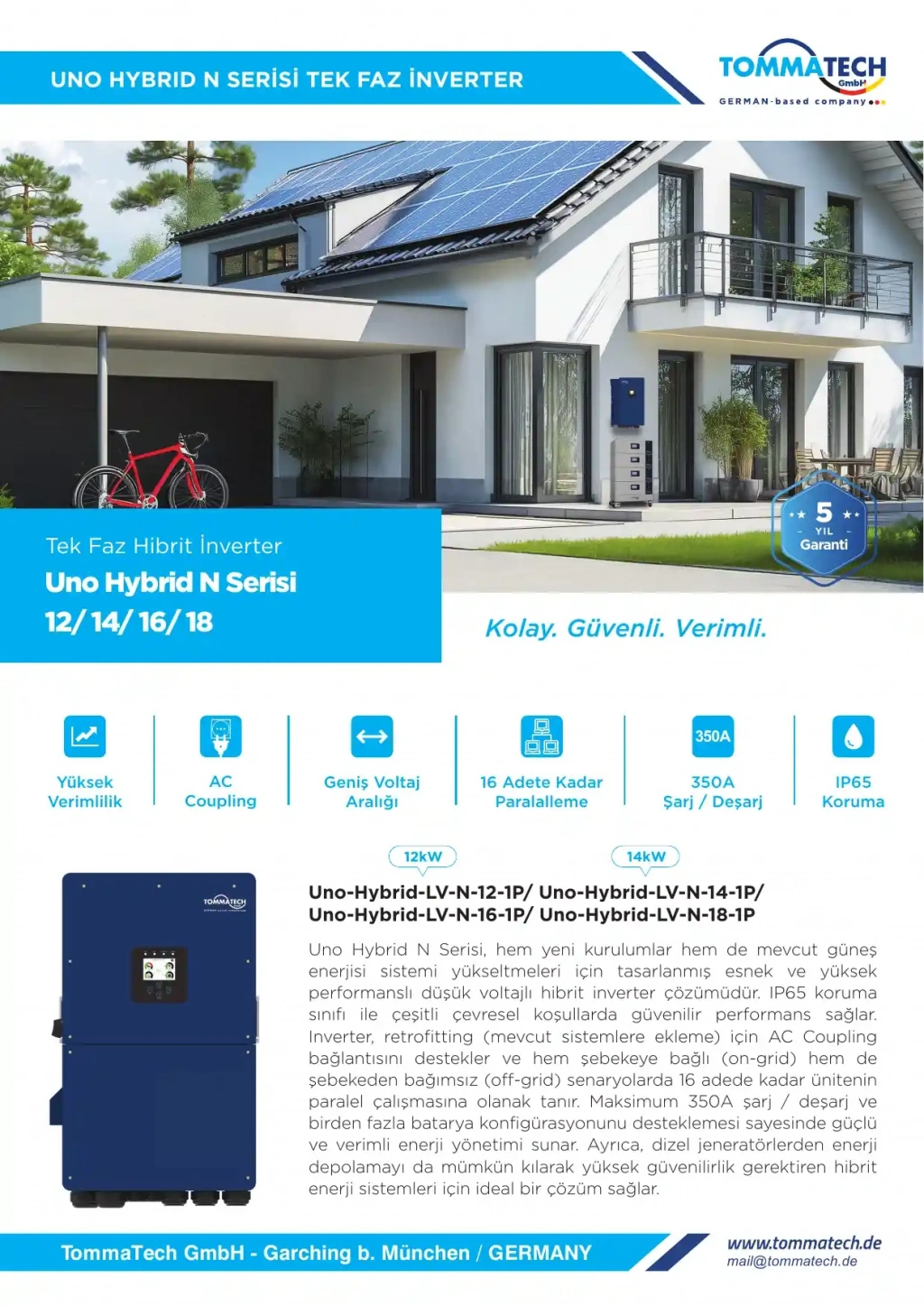 TommaTech Uno Hybrid N Serisi 16.0 kW Tek Faz Hibrit İnverter, yüksek güçlü konut ve ticari güneş enerjisi sistemleri için geliştirilmiş, esnek ve güvenilir bir enerji yönetim çözümüdür. Yeni kurulumlar ve mevcut sistemlerin yükseltilmesi (retrofit) için uygun olan bu inverter, AC Coupling desteği sayesinde mevcut on-grid sistemlerle sorunsuz entegrasyon sağlar.